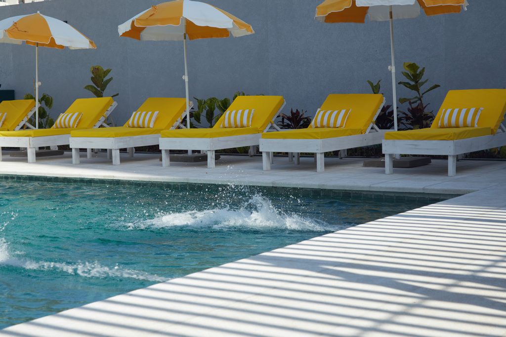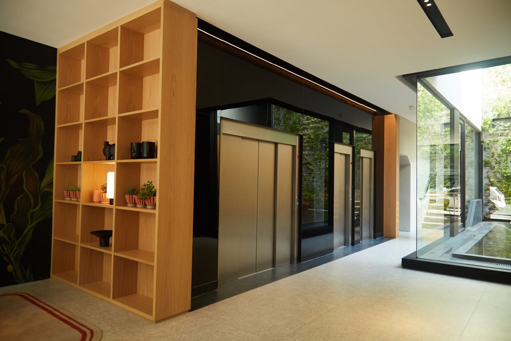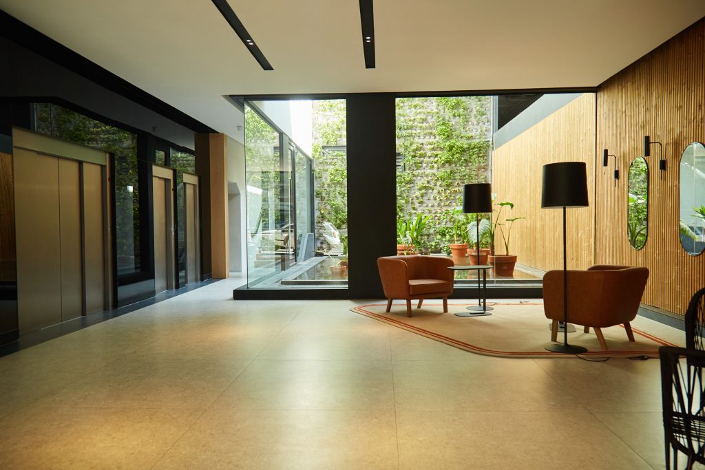 En el patio central de acceso se jerarquizó el espacio mediante un jardín vertical que se refleja sobre un espejo de agua, generando una atmósfera de calma y continuidad visual. El equipamiento y la selección de materiales buscan crear un ambiente cálido y hogareño, otorgando carácter al hall principal y reforzando el espíritu residencial del edificio, pensado para albergar principalmente viviendas familiares.