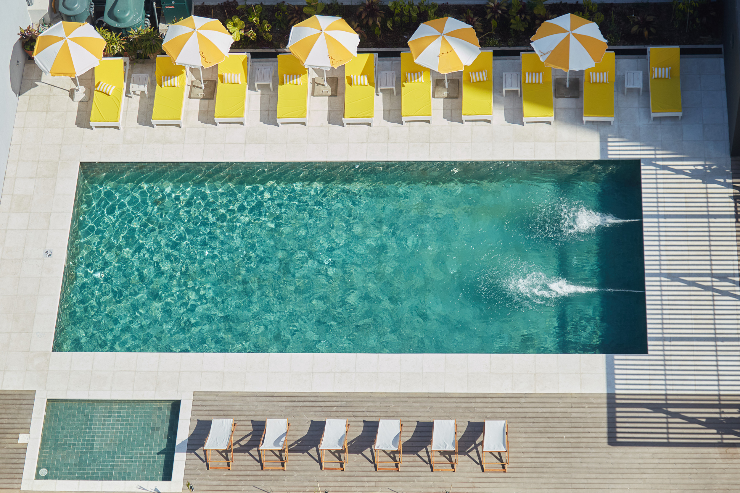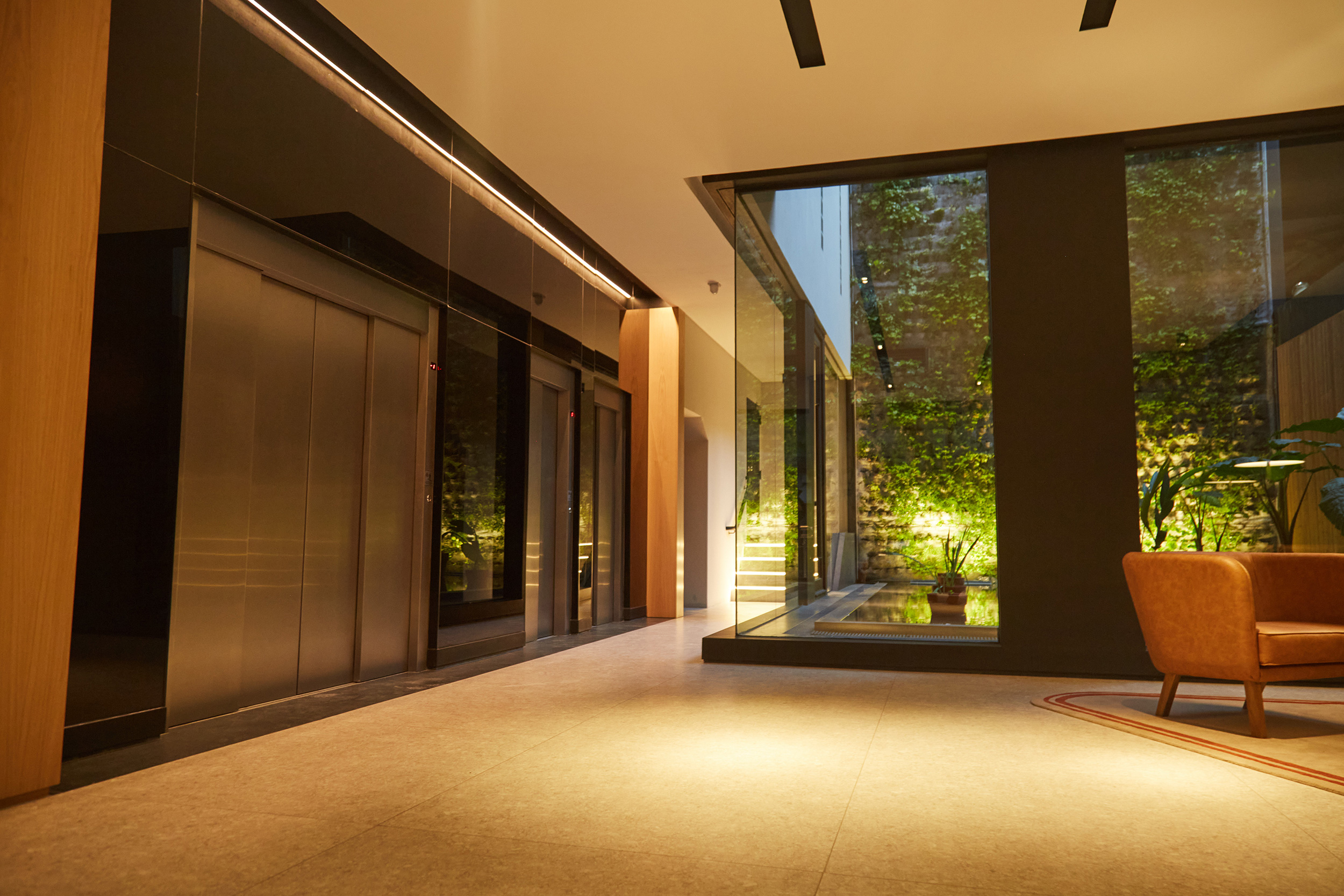 En el patio central de acceso se jerarquizó el espacio mediante un jardín vertical que se refleja sobre un espejo de agua, generando una atmósfera de calma y continuidad visual. El equipamiento y la selección de materiales buscan crear un ambiente cálido y hogareño, otorgando carácter al hall principal y reforzando el espíritu residencial del edificio, pensado para albergar principalmente viviendas familiares.
